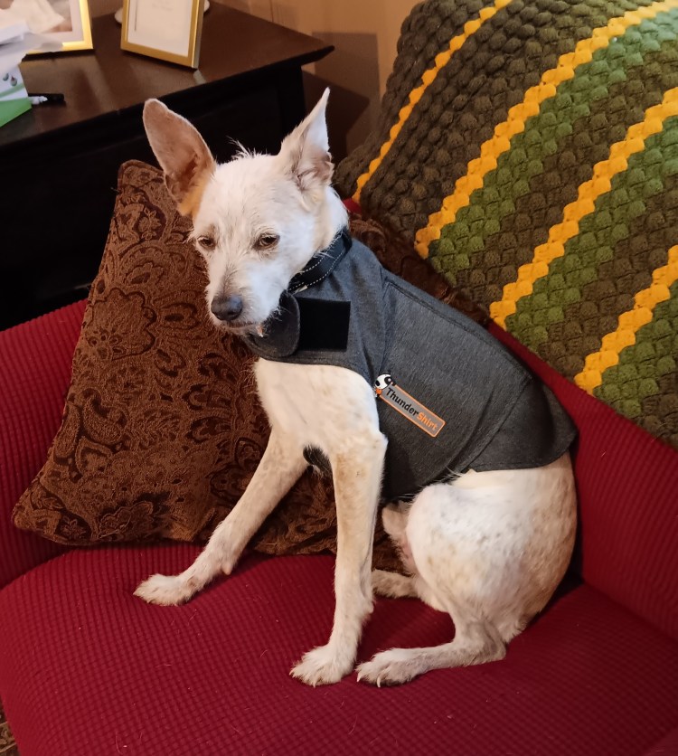 My boy Roland is terrified of thunderstorms and fireworks. We had tried holding him during them, but it only gave him a little comfort. Usually, he would hide under the couch and shake.
